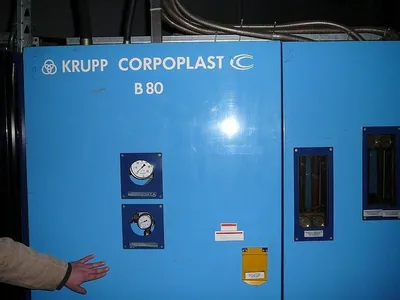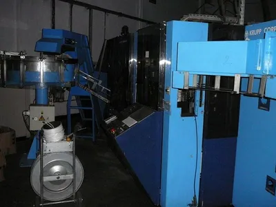 Used blow molder by Krupp Coroplast model B80. Machine can work with maximal output up to 8000 pieces/hour. Range of volume of bottles from 200-3000 cubic centimeter. Maximal dimensions of bottle: length 350 mm x diameter 126 mm. Machine is equipped with 10 forming dies. Power consumption: 380V / 50 HZ / 125 kVA – for heating 108 kW, plus 80 kW for mechanics. Hot air consumption at maximal working output (8000 pieces/hour, bottles with volume 2000 cubic meter) – 25 bar – 480 cubic meter/hour. Pneumatics – 7 bar and consumption 260 cubic meter/hour. Cooling water consumption – temperature 10-15°C and pressure 3 bar – usage 10 cubic meter/hour.