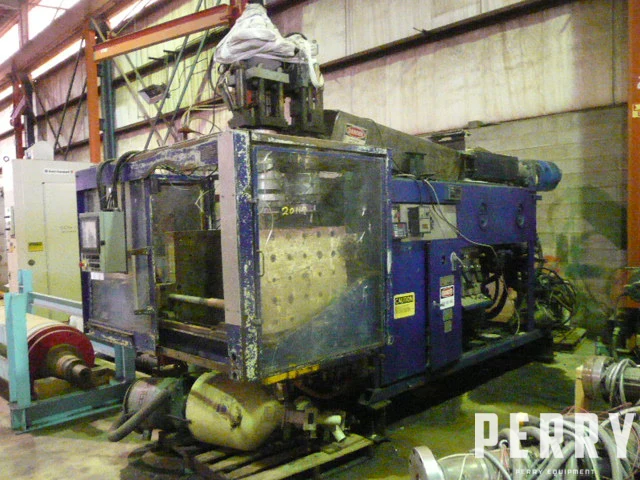 Used Impco model B30-SDH-180 dual 2.5 lb. head blow molder (5 lbs. single head). Has 3.77″ reciprocating screw extruder and updated Omron PLC touch screen controls for machine sequencing and head programming, 30″ wide X 24″ high platens with 23″ of stroke, and 33-ton clamp. Includes pneumatic auxiliary circuits, Hamilton hopper loader and color feeder. New 1980. Serial #PO106.