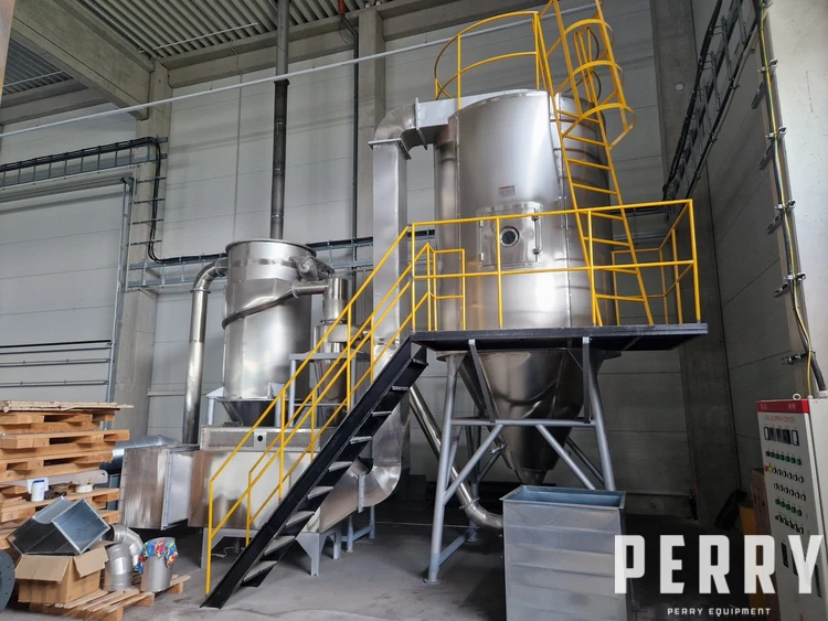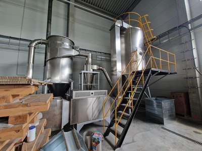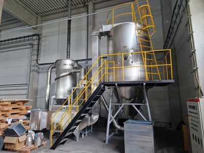 Unused Changzhou Gewei model LPG-50 stainless steel spray dryer. Unit rated 50 kg/hour water evaporation capacity, air inlet temperature 140-550°C. Drying tower has diameter approx. 2200 mm x 5000 mm height of straight side. Includes (1) rotary atomiser model 50 driven by 2.2 kW motor. Unit also includes pre-filter & filter, 90 kW electrical air heater, cyclone, bag filter, suction fan and main switchboard with integrated control panel.