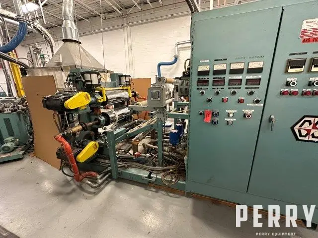 12″ x 30″ Marshall & Williams sheet extrusion stack with individual roll drives, air actuated rolls, SO #23035, Serial #29035. Includes cooling conveyor and rubber pull assembly, pumps and heat exchangers and operator controls.