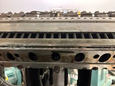 7-layer Cloeren co-ex block with additional sleeves for layer configurations. Feed block with plugs for B/A/C/D/C/A/B. C/A/B/A, C/A/B, B/C/A/C/B, A/B/C, A/C/B/C/A. Previously used as a 3-layer line.