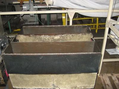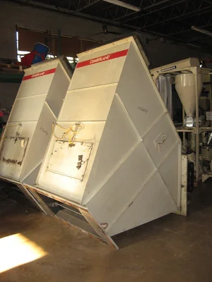 Used Cumberland 62B dual feed hopper with rear mounted 48″ paddle in-feed, paddles powered by a 3 HP DC 180 volt motor, chain and sprocket drive, Boston gear model F231D-24-B9 24:1 gearbox, includes magnetic top in-feed chute.
