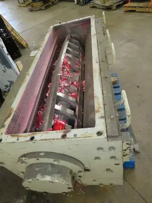 Used Cumberland Model 1456i cutting chamber only. Has 14″ x 56″ feed throat. Has 3-knife twin shear rotor having (6) fly knives and (4) bed knives. Serial #84000-02001. Solid V-belt pulley which is mounted on rotor. Year of manufacture 2002. With 1/2″ screen installed.