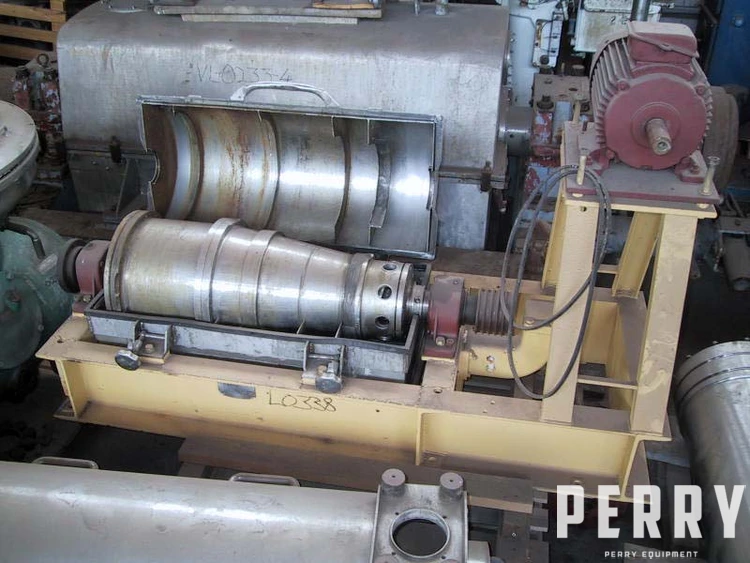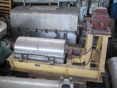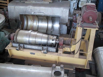 Used DeLaval NX214-31B decanter centrifuge. Maximum bowl speed 3250 rpm. Stainless steel contact parts. 15 HP, 220/380 volt, 3/50 electric motor. Includes gearbox.