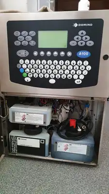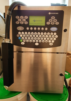 Used Domino A100 stainless steel ink jet coder printer. The A100 can print up to 2 lines with avariety of print formats which include logos, automatic serial numbering/batch coding and real time clocks. Type of keypad: menbrane touch button. Currently installed black atrament color.