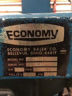 Used Economy Model 72A42-OSH Baler. Serial #61226. 20 HP Reuland motor with 208/220/440 volt, 1800 rpm and Vickers valves and pump.