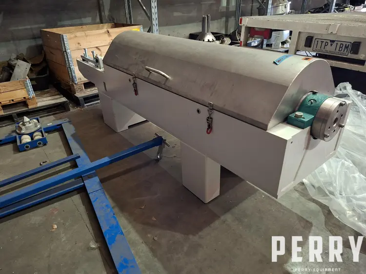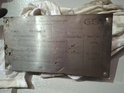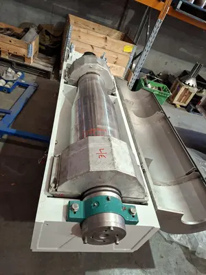 Used GEA model RCD345-00-00 stainless steel decanter centrifuge. Unit has an approximately 340mm diameter x 1360mm long bowl. Bowl can operate to a max speed of approximately 4500rpm at a temperature of 5 to 105 degC.