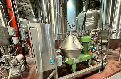 Mounted on a stainless steel brewery skid with piping and pumps