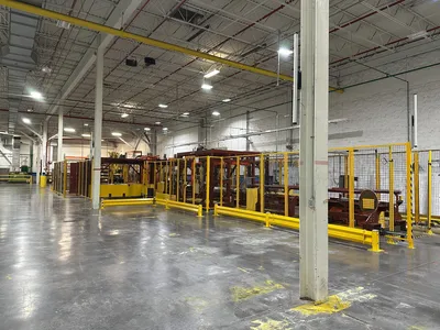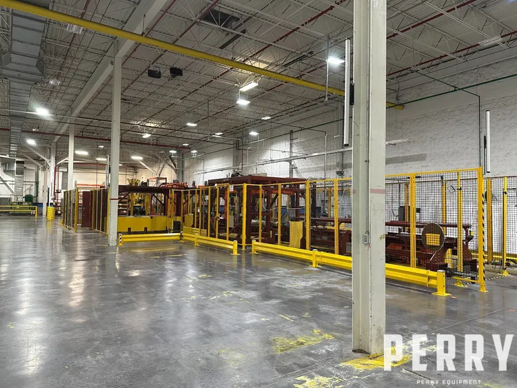 Also includes Synergy Revolver automatic wrapping system with Highlight Industries ring wrapper, entry and exit chain transfer conveyors, turntable-type rotary stretch wrapper, and additional chain-type transfer tables. Complete with roll palletizing station.