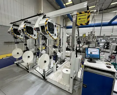 – Reel Stand. 3 plies of paper (19mm, 19.4mm, 21mm left to right) used to make a 7.3mm straw. 2 reels (bobbins) on each station.