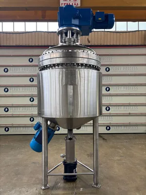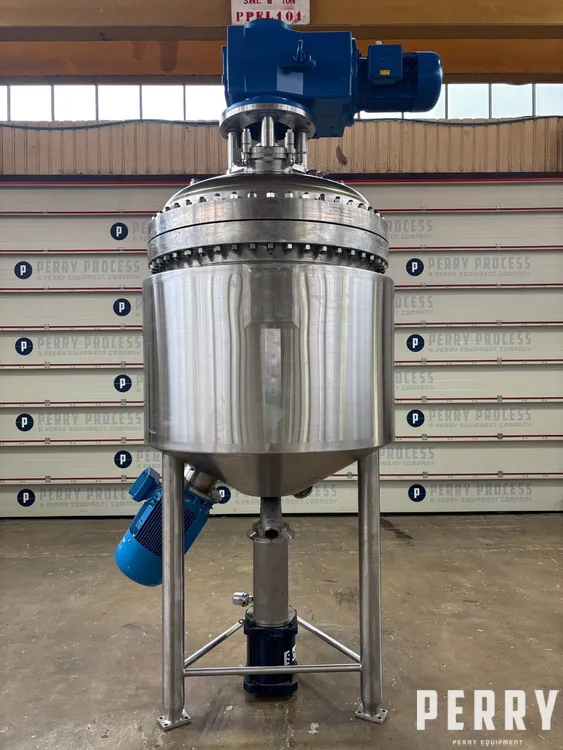 Unused Briggs of Burton approximately 1,200 litre 316/316L stainless steel process vessel. Unit measures approximately 1,200mm diameter x 870mm straight side. Unit has bolted dished top and welded hemispherical bottom head. Internal rated 10 bar/full vacuum design pressure at -20 to 210 deg.c. External 304/304L stainless steel jacketed rated 10 bar/full vacuum design pressure at -20 to 210 deg.c. Unit has top entry 316/316L stainless steel gate type agitator fitted with PTFE wall scrappers, driven by 11kw motor/gearbox. Unit includes bottom entry Silverson model BE600 316/316L stainless steel emulsifier driven by 22kw motor. Unit is mounted on 304/304L stainless steel legs.