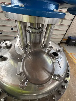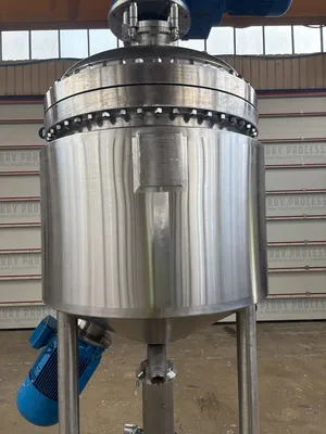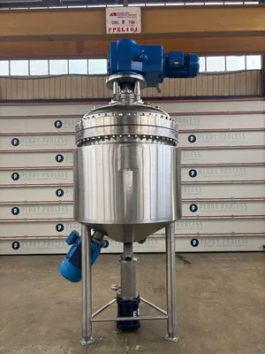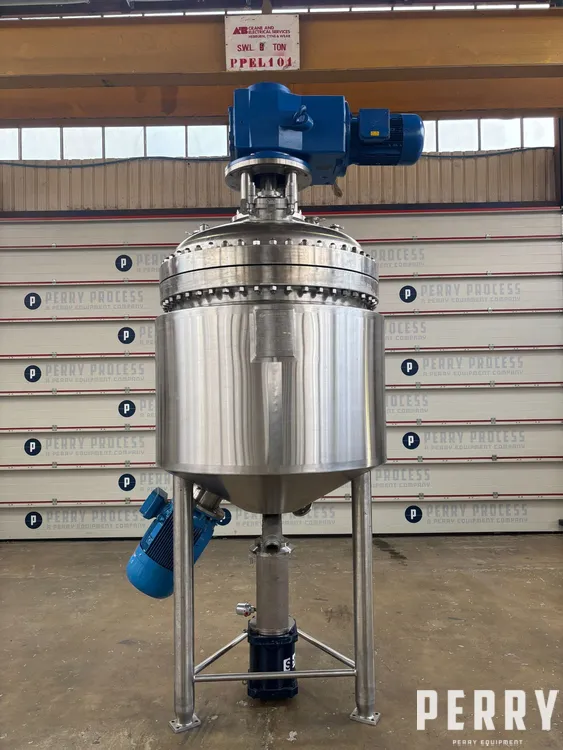 Unused Briggs of Burton process vessel made from approximately 1,200 liters of 316/316L stainless steel. The unit measures approximately 1,200 mm in diameter x 870 mm smooth side height. The unit has a screwed domed top lid and a welded hemispherical bottom. Internal design for 10 bar / full vacuum pressure at -20 to 210 °C. External jacket made of 304/304L stainless steel, jacket cooled, design protected for 10 bar / full vacuum pressure at -20 to 210 °C. The unit is equipped with a top-mounted, gate-like agitator made of 316/316L stainless steel with PTFE wall scrapers, driven by an 11 kW motor/gearbox. The unit includes a bottom-mounted Silverson model BE600 emulsifier made of 316/316L stainless steel, driven by a 22 kW motor. The unit is mounted on 304/304L stainless steel legs.