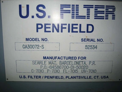 Unused US Filter Pennfield model CA300-72-S deionizer system. (1) carbon filtration tank, (1) ultra violet sterilizer pump, and control panel. Serial # 53534.