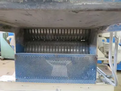 Used Retech Horizontal Shredder. Model VH34/75, serial #8810010, new 2006. Has 5″ x 34″ in-feed opening, 16″ diameter 44 cutter rotor with a 390 RPM rotor speed. Rotor is belt driven by a 75 hp 460 volt 1185 rpm motor. Two infeed rollers are powered by approximately 1 Kw SEW Euro drive motors and gearboxes. 41.5″ in-feed height. 2″ holes screen installed. Gravity discharge. Includes stand-alone starter/control panel and a 30′ long vibratory in-feed conveyor (no controls for conveyor).