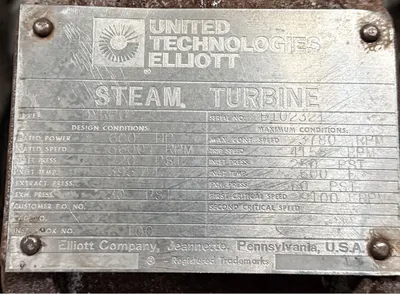 Used Elliot Steam Turbine Generator with Marathon Generator rated at 350 KW, 480 Volt, 60 Hz, 3 Phase.