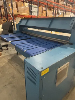 Used 84” Rosenthal Sheeter, Model WAS-7- HUJEAACPLC. PLC controls, One roll shafted unwind with a 3” diameter air shaft. Rubber covered Pinch rollers.