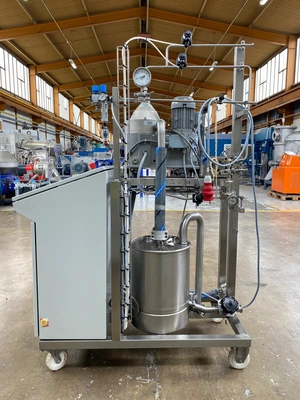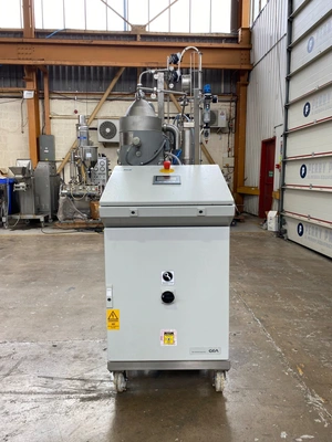 Used GEA Westfalia model FSD 1-06-107 stainless steel disc bowl centrifuge. Clarifier design with total capacity 1 litre and solids holding space 0.5 litre. Heavy liquid 1.0 kg/dm3 and solids 1.4 kg/dm3 solids. Maximum speed rated 10,000rpm. Centripetal pump output up to 300 l/h depending on medium. Belt driven by 1.1 kW 220/380 volt 3/50 3,000 rpm motor. Mounted on skid with HMI control panel and stainless steel collection pot. New 2018.