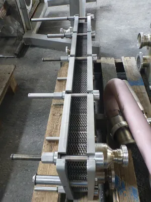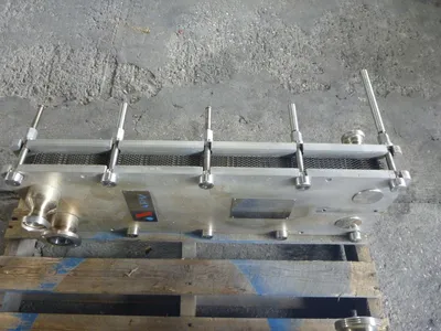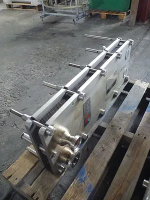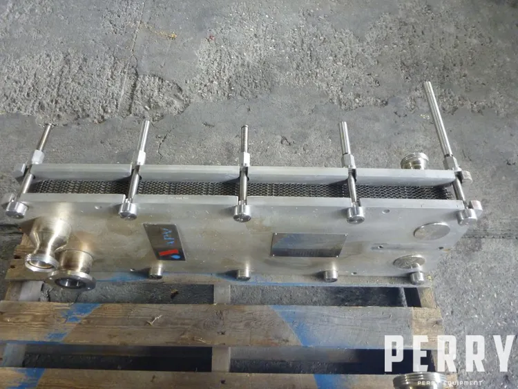 Used stainless steel plate heat exchanger by APV type H17. Heat exchange surface 3.2 m2. Output 16.7 kW. Working volume – side 1 – 6 l, side 2 – 6 l. Working pressure 6 bar. Test pressure 10 bar. Working temperature 100 C / 0 C.