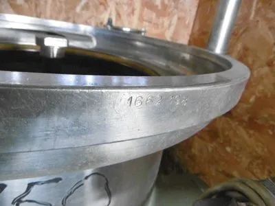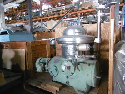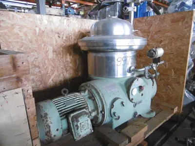 UNUSED Westfalia SA14-06-076 disc bowl centrifuge frame with out bowl. Clarifier (2-phase) design. SN 1662-198. Cast iron frame w/brake, oil level sight glass and revolution indicator for bowl speed check. Drive by standard flange mount motor. Power transmitted via centrifugal friction clutch and worm gear to the bowl spindle. All bearings and the gear splash lubricated from central oil bath. Pressure discharge of the clarified liquid by built-in centrifugal pump.