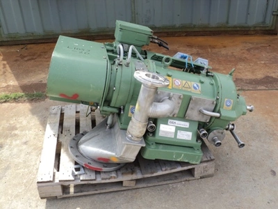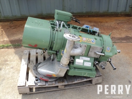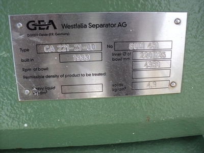 Used Westfalia model CA221-21-00 stainless steel decanter centrifuge. Bowl 220mm/125mm diameter. Belt driven by 15 kW 380-420 volt 3/50 2920 rpm motor at maximum 4350 rpm. Solids maximum 4.3 kg/dm3. Unit is ex proof design. New 1999. Rated capacity 7,000 L/H depending on application.