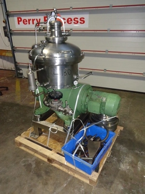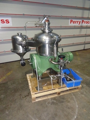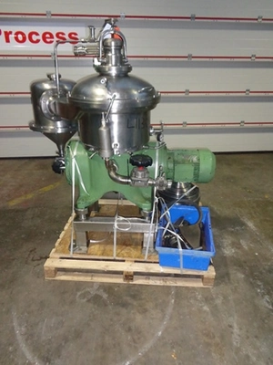 Used Westfalia type CSA 19-47-476 stainless steel clarifier centrifuge. Bowl type Hermetic inlet with Hermetic liquid outlet for light phase. Gas tight up to 300mm WC with sanitary covers including sediment cover and type B5 flanged motor with coupling. Direct driven by 7.5 kW 380/420 volt 3/50 motor at maximum 8150 rpm. Suitable for feed 1.0 kg/dm3 and solids 1.3 kg/dm3. Rated capacity 7,000 liter/hour depending on product. Mounted on stainless steel base and includes some tools.