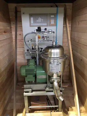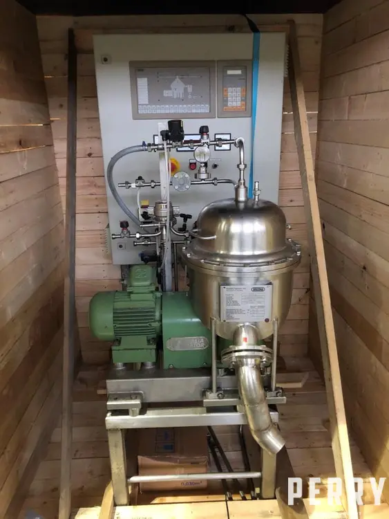 Used Westfalia model CSA1-06-475 stainless steel clarifier centrifuge. Self cleaning bowl in steam sterilizable design. Internal pressure rated 1.5 bar pressure at 127 deg.c. Capacity rated approximately 13 litre. Unit includes 1.5kw, 1415rpm drive. All mounted on skid. Includes tools
