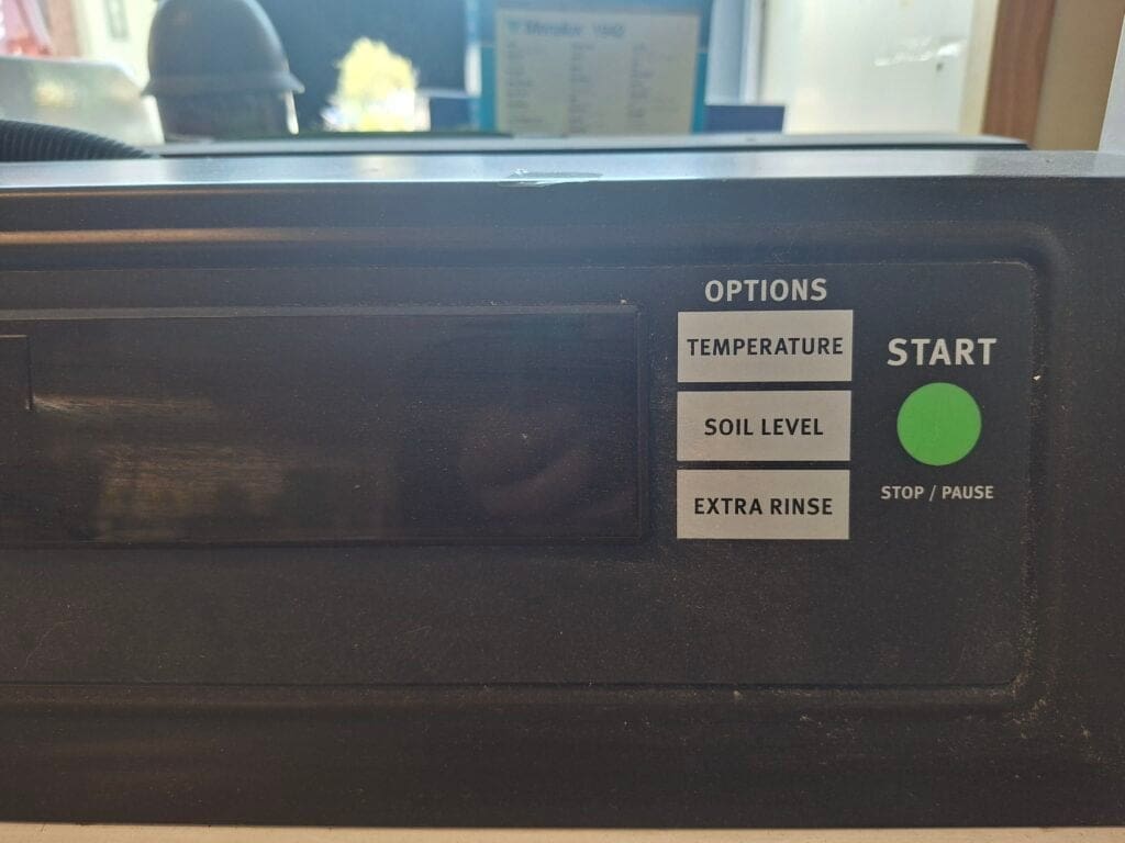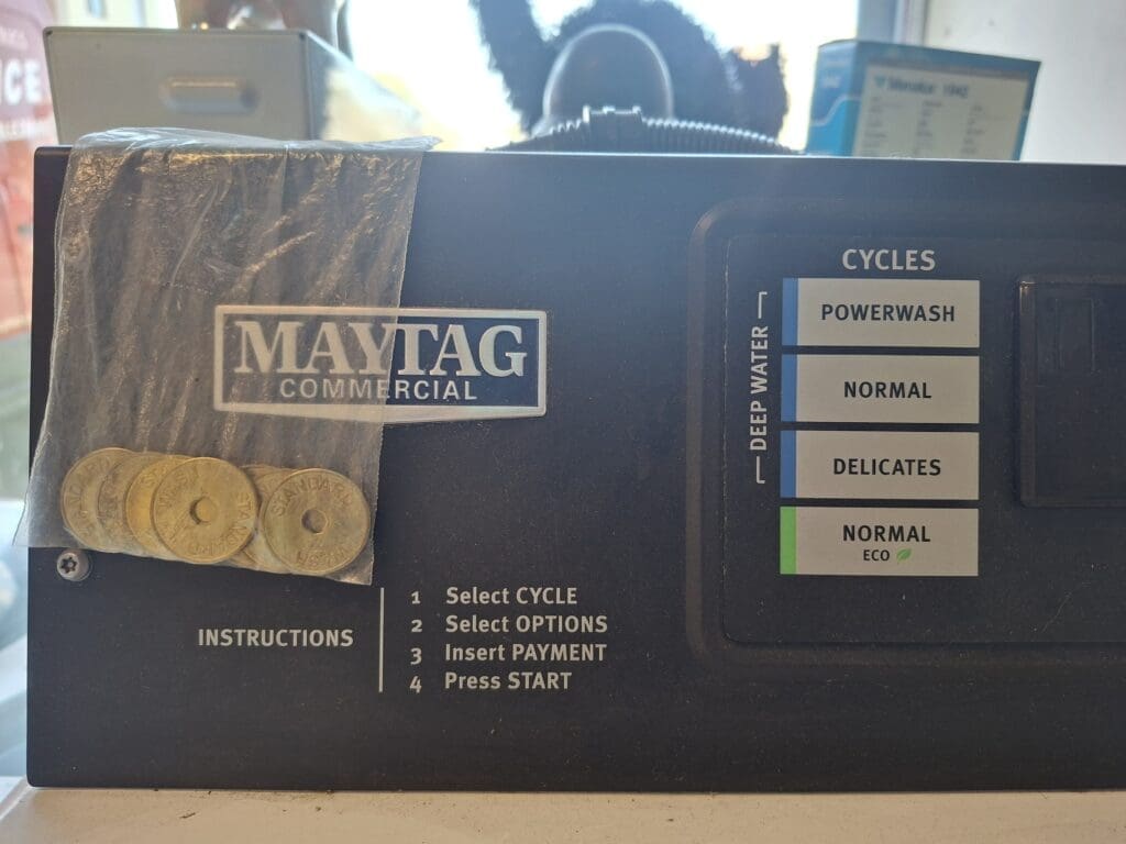 Freestanding Maytag coin operated commercial top-loader washing machine.