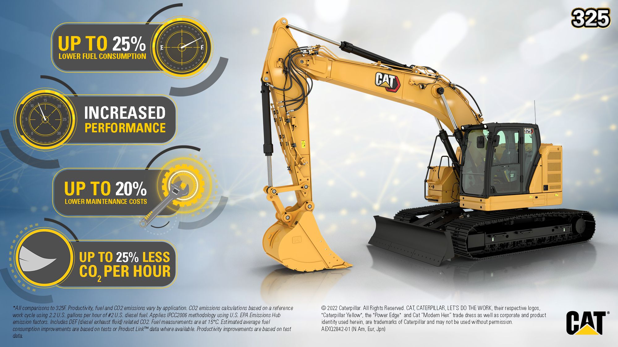 *All comparisons to 313F. Productivity, fuel and CO2 emissions vary by application. CO2 emissions calculations based on a reference work cycle using 2.2 U.S. gallons per hour of #2 U.S. diesel fuel based. Applies IPCC2006 methodology using U.S. EPA Emissions Hub emission factors. Includes DEF (diesel exhaust fluid) related CO2. Fuel measurements are at 15°C. Estimated average fuel consumption improvements are based on tests or Product Link® data where available. Productivity improvements are based on test data.