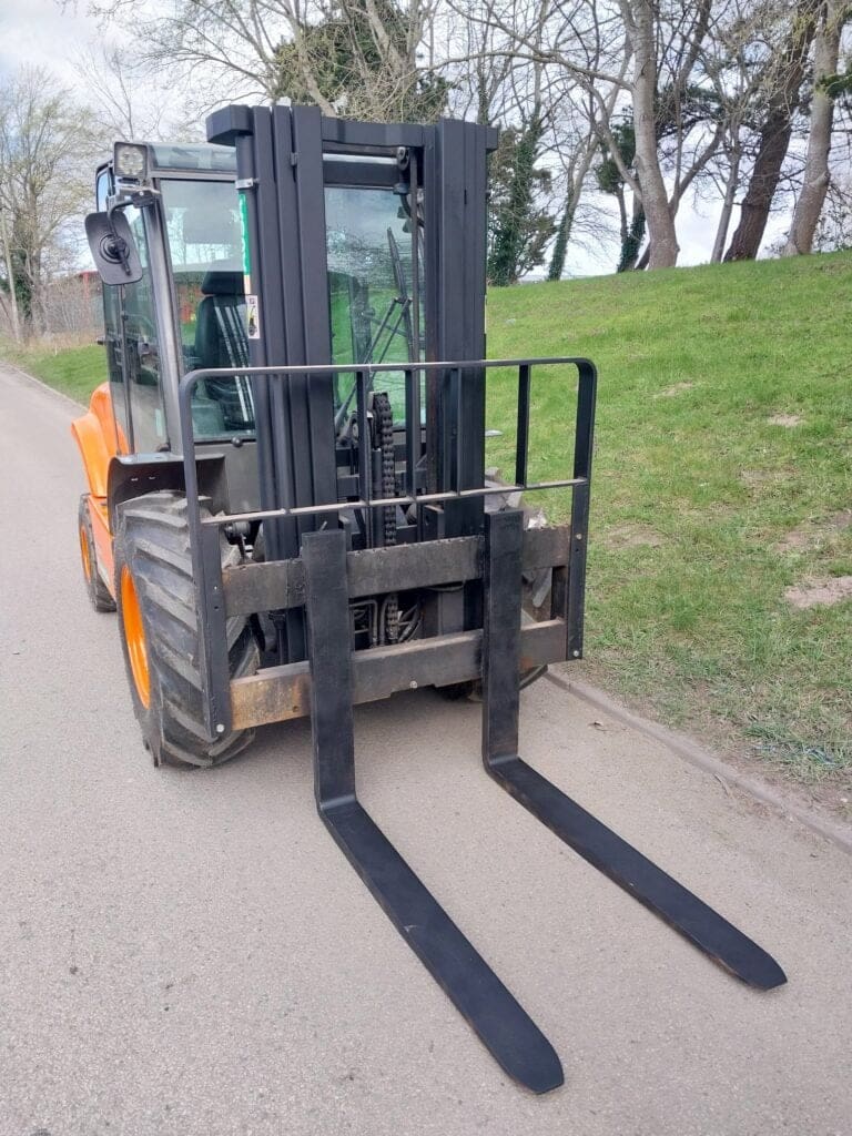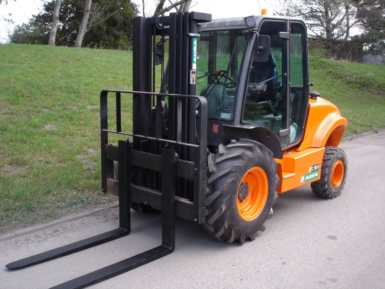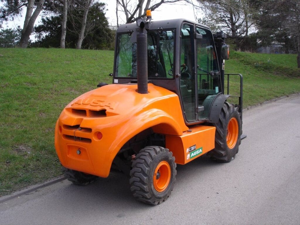 A rare opportunity to buy a used Ausa Compact Rough Terrain Fork Lift With 3,000 kgs capacity, sideshift, free lift triplex mast, led lighting, new tyres all round, 1200 long forks, serviced, checked, repaired, suitable for many applications where your industrial forklift gets stuck on unmade ground, loading containers, nursery & garden centre applications etc £22500 plus vat