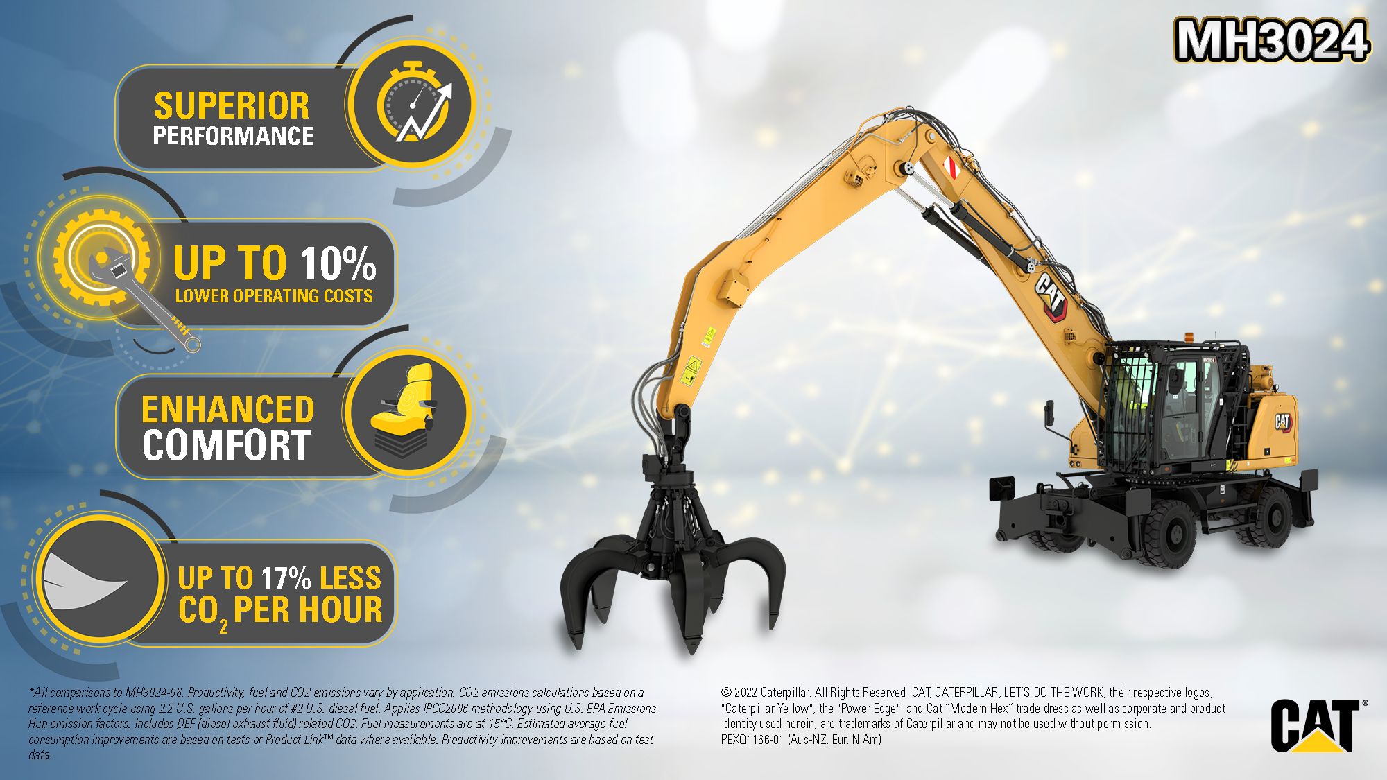 *All comparisons to MH3024-06. Productivity, fuel and CO2 emissions vary by application. CO2 emissions calculations based on a reference work cycle using 2.2 U.S. gallons per hour of #2 U.S. diesel fuel based. Applies IPCC2006 methodology using U.S. EPA Emissions Hub emission factors. Includes DEF (diesel exhaust fluid) related CO2. Fuel measurements are at 15C. Estimated average fuel consumption improvements are based on tests or Product Link data where available. Productivity improvements are based on test data.