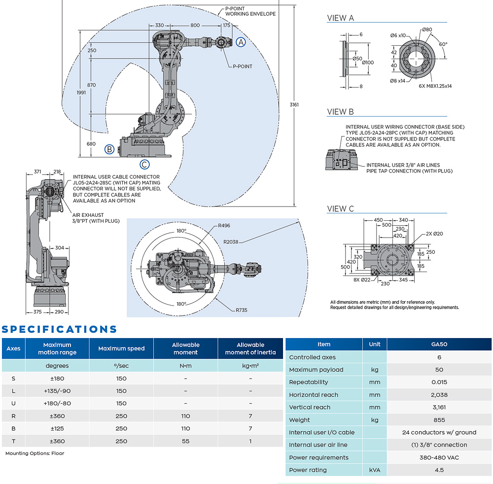 Highly versatile, the six-axis GA50 robot is well-suited for laser welding, laser cutting, plasma cutting and dispensing tasks. Featuring fast access speeds and acceleration capabilities, this robot can reduce cycle time and increase production throughput. High rigidity and precision drives offer exceptional path accuracy, and a high payload capacity supports the use of a Remote Laser Welding head, when needed. A reduced interference design enables close proximity placement to other robots and equipment for high-density layouts.