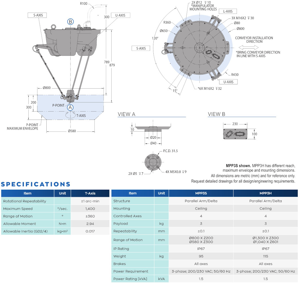 The ideal delta robot for high-speed picking operation – speeds up to 150 cycles per minute (CPM) with full 3 kg payload. This IP67-rated delta has a 1,300 mm horizontal reach and a 601 mm z-stroke. Highly accurate ±0.1 mm repeatability.
